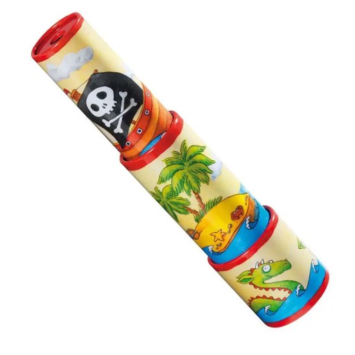Kalejdoskop dla dzieci "Luneta małego pirata" Goki pozwala na obserwowanie otoczenia w zniekształcony sposób, zniekształca i powiela kolory oraz kształty. Wykonana jest z metalu, składa się z 3 części. Jedna z nich jest wysuwana.