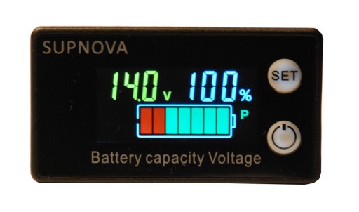 Miernik naładowania baterii, akumulatora - woltomierz panelowy, 8-84V. Miernik wskazuje w sposób graficzny poziom naładowania baterii, wyświetla również wskazanie napięcia w woltach oraz wartości procentowe. Miernik działa dla napięć od 8-84V - wskazania graficzne (8-100V pomiar napięcia). Obsługuje akumulatory kwasowe, litowe, litowo-żelazowe - wymagane zaprogramowanie rdozaju ogniw.