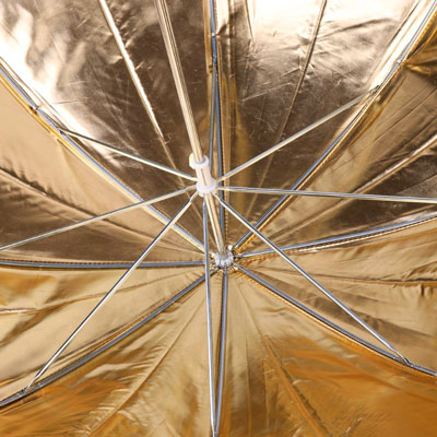 ✔ Parasolka odbijająca złota odbija i ociepla światło kierowane na fotografowany obiekt, niwelując jednocześnie cienie. Złota powłoka daje efekt przypominający zachód lub wschód słońca. Czarna, zewnętrza strona parasolki pozwala kontrolować ilość światła skierowaną na fotografowaną scenę. Czarna powłoka zatrzymuje światło w czaszy, dodatkowo wytłumia światło odbite, dzięki czemu w kadrze nie będzie niepożądanych refleksów.