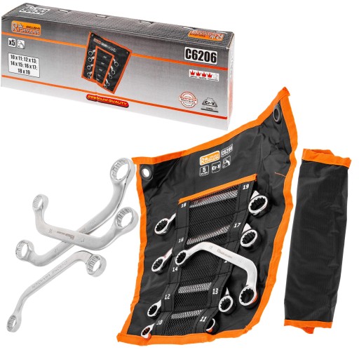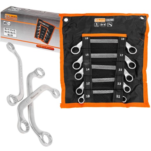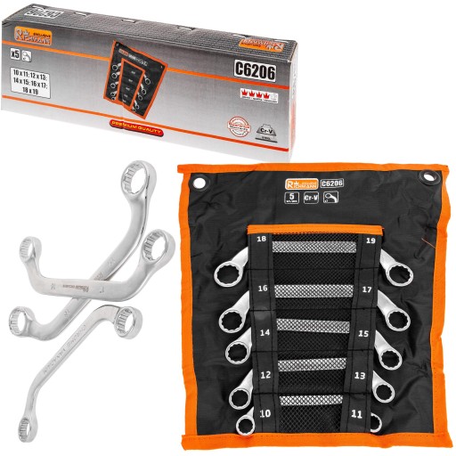 - Zestaw 5 sztuk kluczy oczkowych typu „C”, dwustronnych, chromowanych w zakresie rozmiarów 10 - 19 mm.