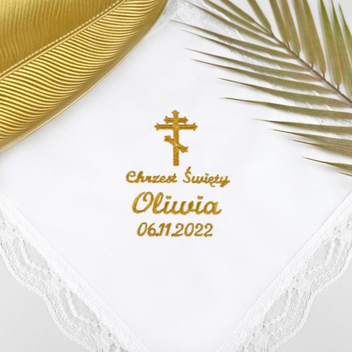 - posiada wyhaftowany krzyż prawosławny oraz napis "Chrzest Święty" + imię i datę chrztu
