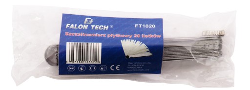 Wysokiej jakości szczelinomierz listkowy firmy FALON-TECH składający się z 20 listków pomiarowych o różnych grubościach.