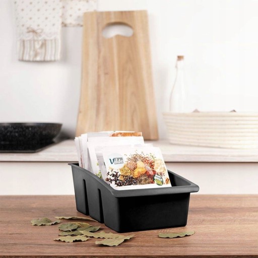 🍽 Pojemnik do przechowywania torebek z przyprawami wykonany z tworzywa w kolorze czarnym. Pozwoli utrzymać porządek w szafce lub szufladzie z ziołami i przyprawami.