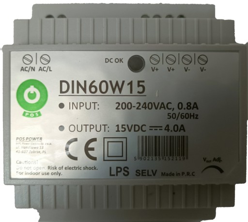 Zasilacz na szynę DIN 15V, 60W, 4A