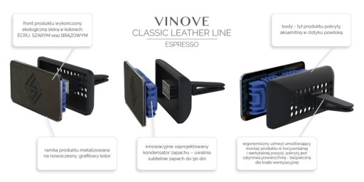 VINOVE jest nową marką perfum samochodowych, stworzonych przez polskich pasjonatów we współpracy z francuskimi mistrzami sztuki perfumeryjnej i włoskimi projektantami oraz naukowcami. VINOVE to ekskluzywne perfumy samochodowe. Do produkcji perfum samochodowych VINOVE zastosowano technologię XXI wieku. Wykorzystano wiedzę, otwartość i doświadczenie zespołu naukowców i wspólnie z nimi skondensowano zapachy w nowatorskim polimerze. Ich kształt jest tak skonstruowany, by powietrze z wywietrzników samochodowych delikatnie opływało polimerowy labirynt, uwalniając zapach subtelnie i długotrwale – aż do 90 dni. Projektując nośnik zapachu wzięto pod uwagę przede wszystkim jego walory użytkowe: długotrwałość uwalniania zapachu, bezpieczeństwo dla tapicerki i kokpitu samochodu, a także ekskluzywny wygląd, współgrający ze stylistyką nowoczesnych aut.