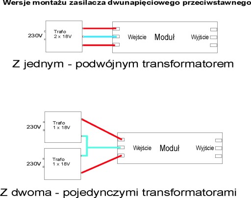Na wyjściu zasilacza otrzymujemy dwa napięcia o jednakowych wartościach, lecz o odwrotnych polaryzacjach i wspólnej masie.