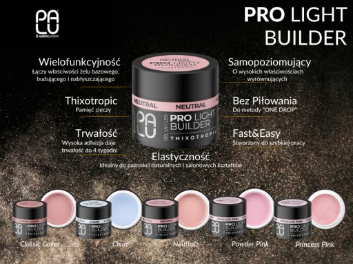 PRO LIGHT BUILDER GEL to żel, który posiada właściwości produktu bazowego, budującego i nabłyszczającego. W swojej budowie zawiera substancje adhezyjne, które zwiększają przyczepność do naturalnej płytki paznokcia, substancje budujące i nabłyszczające. Aby osiągnąć optymalny efekt przyczepności przy cienkich, problematycznych płytkach warto zastosować wcierkę z dowolnej bazy Palu.