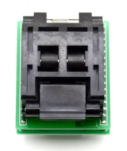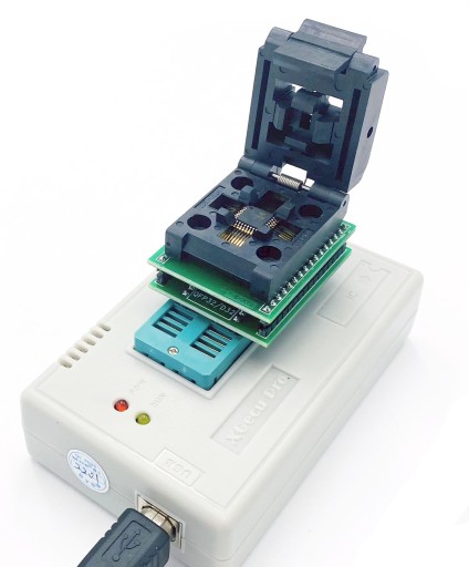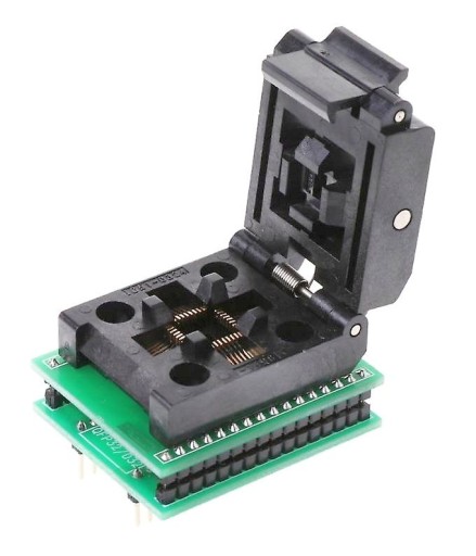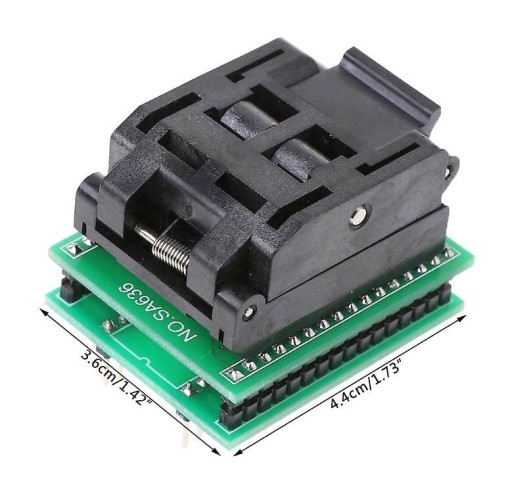Adapter uniwersalny TQFP32 / LQFP32 / QFP32 (SMD) na PDIP32 z wygodną podstawką typu Clamshell ZIF QFP32 (serii IC51-0324) - adapter dla mikrokontrolerów oraz innych układów (np. ATmega8/48/88) w obudowach TQFP32 lub LQFP32 (z rastrem 0,8mm) pozwalający na programowanie i używanie ich w podstawkach bądź pad'ach DIL32 lub większych programatorów wyposażonych w złącze ZIF ( XGecu TL866CS/A/II Plus, T48, T56, Xeltek Superpro itp) bądź innych urządzeń (np. prototypów, płytek stykowych itp.).