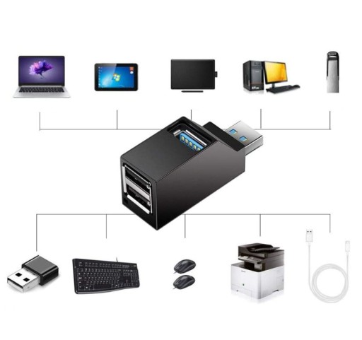 3-portowy HUB: 1x USB 3.0 2x USB 2.0 - Od dziś koniec z odłączaniem innego sprzętu jeśli chcesz podłączyć nowe urządzenie do USB. Włączanie dysków twardych USB lub pendrive'ów wedle indywidualnych potrzeb. Dzięki USB 3.0 można osiągnąć znacznie wyższą prędkość transmisji danych do 5 Gb/s. Hub pozwala na podłączenie do urządzenia z USB urządzeń z USB3.0, 2.0 i starszych np. myszki, klawiatury, aparatu, kamery, pamięci flash itp. Hub nie wymaga żadnych sterowników. W zestawie: smyczka ułatwiająca wygodne przenoszenie i zatyczka na USB chroniąca przed kurzem i zabrudzeniami.