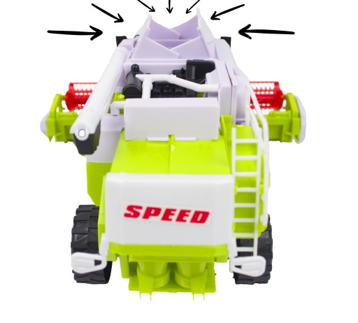 - heder - umieszczony na przodzie zabawki obraca się oraz podnosi, by ustawić wysokość koszenia zboża (blokowany wałkiem dociskowym). Można go również zdjąć całkowicie i umieścić na załączonym do zestawu wózku do transportu;
