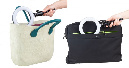 - Pierścieniową lampę LED Lampa LED Bi-Color z wygodną regulacją jasności i temperatury barwowej za pomocą mini-pilota umieszczonego na przewodzie zasilającym USB.