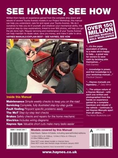 W książce opisano samochód Toyota Avensis (oznaczenie fabryczne T22), modele od 1998 do I 2003 roku, wyposażone w silniki benzynowe. Poradnik zawiera opis wersji Sedan (Saloon), Hatchback oraz Kombi (Estate).
