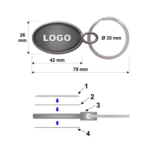 Graficzne logo na przedniej stronie breloczka wykonane technologią domingu. Nadruk grafiki wykonany na srebrnej folii metalizowanej [2], zalanej specjalnym polimerem o dużej przejrzystości i dużej odporności na zarysowania, matowienie, promienie słoneczne (UV) [1]. Całość wklejona na przedniej stronie breloczka [3].
