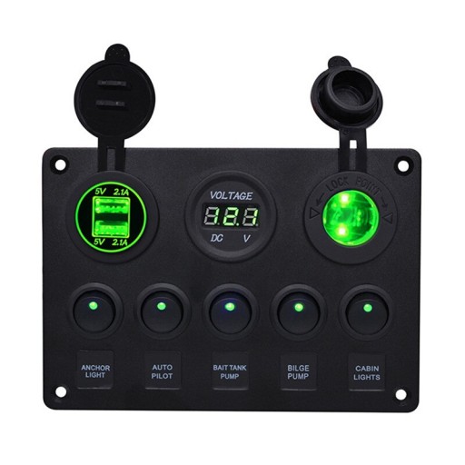 Nowy 5 Gang Panel sterowania przełącznikiem z 2 USB i woltomierz wysokiej jakości trwałe dokładne LED Rocker 12V/24V samochodów łódź Marine #294844 Funkcja: Zupełnie nowy i wysokiej jakości Tył z funkcją zabezpieczenia bezpiecznika 15A. Prezentowane z etykietami pojazdów i morskich, łatwe do majsterkowania. Wstępnie okablowane, aby łatwo zainstalować zarówno w pojeździe 12V, jak i 24V, jachcie, statku, przyczepie kempingowej, ciężarówce itp. Panel przełącznika do sterowania uniwersalnym sprzęt elektryczny w pojeździe: reflektor, światło przeciwmgielne, szerokość światła, lodówka samochodowa przełącznik, samochód przełącznik próżniowy, wziąć elektryczny dla samochodów sprzęt zewnętrzny, zapalniczki i tak dalej. Podwójne porty USB do ładowania (DC 5V/2,1 a, 5V/2,1 a), ładowanie telefonów, tabletów, aparatów fotograficznych, GPS, słuchawki bezprzewodowe itp. Zapalniczka 12V/24V może zapalić papierosy. Cyfrowy wskaźnik napięcia pomaga monitorować bezpieczeństwo elektryczne pojazdu od 5V do 30V. Łatwa wymiana, ochrona panelu przed przegrzaniem, nadmiernym prądem, nadmiernym ładowaniem i zwarciem. Wysokiej jakości, trwalszy i panel z litego aluminium niż plastik lub drewniany. Specyfikacja: Napięcie wejściowe: DC 12V/20a, 24V/10a Gniazdo papierosów: 12V/ 24V Temperatura pracy: -20 deg; c ~ + 110 deg; c Przełącznik kołyskowy: 5 15A bezpiecznik Inline uchwyt skrzynki Przełącznikiem typu: On - Off USB: 5V 2.1A + 2.1A Kolor diody LED: niebieski Materiał: ABS + PC + aluminium Rozmiar: 15cm/5.91 cala x 10.5cm/4.13 cala x 8cm/3.15 cala. Ważna uwaga: Ze względu na różnicę w ustawieniu światła i ekranu, kolor elementu może się nieznacznie różnić od koloru na zdjęciu. Proszę pozwolić na niewielką różnicę wymiarów ze względu na różne pomiary ręczne. Pakiet zawiera: 1 x Panel przełącznika kołyskowego Brak