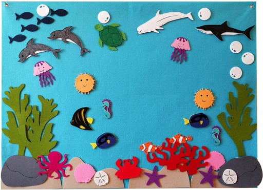 Filcowe akwarium z dekoracjami na rzepy (42 elementy do dowolnego ozdobienia). Wymiary to ok. 100 x 80cm. Filcowa ozdoba ścienna nawiązuje do podwodnego świata zwierząt i roślin oraz jest świetnym pomysłem na prezent dla malucha - rozwija kreatywność i zdolności manualne dziecka :)