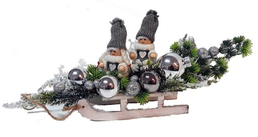 Przepiękny, oryginalny, wykonany z dbałością o szczegóły, niepowtarzalny stroik świąteczny w odcieniach bieli,srebra i zieleni. Na sankach wprowadzi nas w magiczny okres Świąt. Można go postawić w centralnym miejscu na stole wigilijnym, na komodzie, parapecie lub na kominku, udekoruje każde niezagospodarowane jeszcze miejsce, w które wniesie odrobinę klimatu zaczarowanych Świąt Bożego Narodzenia.