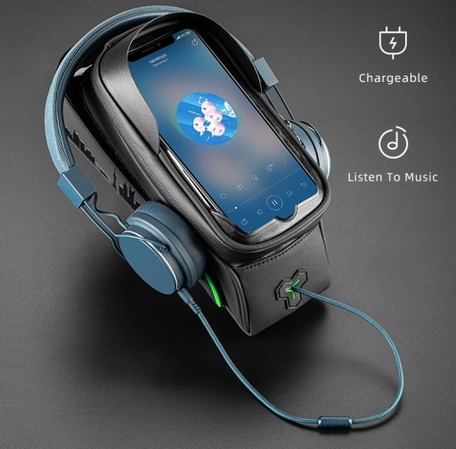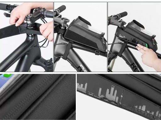 Nowoczesna torba rowerowa montowana na ramie z etui na smartfon.