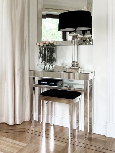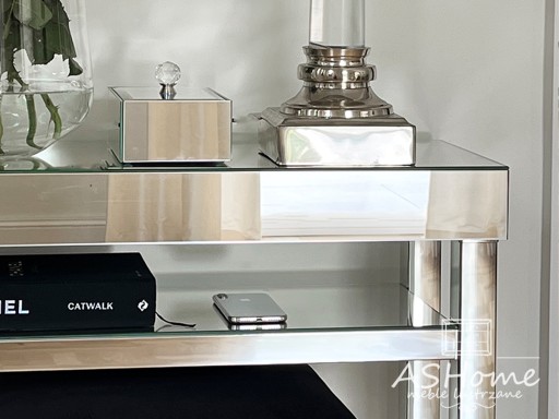 Półka jest wykonana także z lustra kryształowego i zamocowana 10 cm poniżej blatu. Mocowanie półki jest solidne i stabilne, również na stelażu chrom. Poprzeczne wzmocnienia, na których płożona jest półka, są bardziej dyskretne, i stelaż ma wymiary 3,5 cm x 3,5 cm. Dodatkowo półka posada prosty system, który ogranicza jej przesuwanie i stabilizuje na miejscu, dając pewność, że się nie zsunie. Stelaż konsoli i półka do samodzielnego montażu. Do mebla dołączony jest druk z wytycznymi do złożenia lustrzanej konsolki. Montaż jest bardzo prosty, a klienci nie mają z nim najmniejszych problemów, wystarczy jedynie wkręcić nogi, które mają już przymocowane odpowiednie końcówki, aby można było w dalszym etapie nasadzić poprzeczki i położyć na nich półkę.