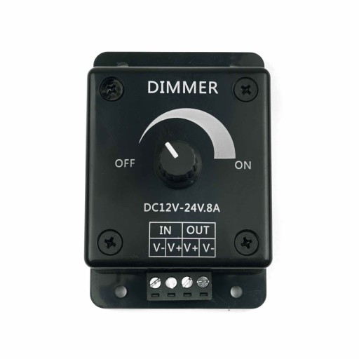 Manualny ściemniacz do taśm ledowych pracujący z napięciem od 12V do 24V i prądem aż do 8A. Posiada funkcję włącz/wyłącz oraz pozwala na płynną regulację mocy świecenia bez efektu migania. Moduł posiada bardzo dobry stosunek ceny do obciążenia jakie obsługuje. Dzięki złączom terminal block wygodnie zamocujemy przewody dokręcając je śrubokrętem. Obudowa w kolorze czarnym.