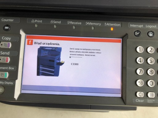 Wizualnie kserokopiarka wygląda bardzo dobrze jednak po włączeniu wyświetla błąd C-3300 widoczny na siódmym zdjęciu. Wcześniej drukowała oraz wyświetlał się komunikat - czas na konserwację. Być może wystarczy standardowy przegląd i wszystko będzie działać poprawnie ale nie gwarantuję. Osobiście się na takim sprzęcie nie znam i sprzedaje w takim stanie jak jest.