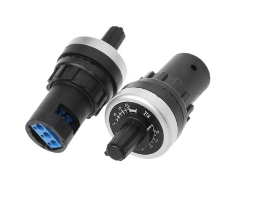 Potencjometr o oporności 2 kOhm dedykowany do przemienników częstotliwości. Jest bardzo szczelnie wykonany w klasie IP65. Temperatura pracy -20-60*C. Obudowa przygotowana jest pod montaż w otwór fi22. Posiada zaciski śrubowe co pozwala szybko i sprawnie go zamontować.