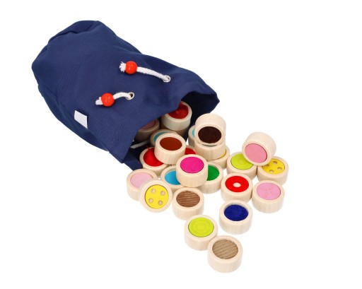 16 różnych materiałów w drewnianych cylindrach (jest ich 32, po dwa takie same wzory) pozwala dzieciom na sprawdzenie swojego zmysłu dotyku. Maluch dotykając materiał w cylindrze ma za zadanie odnaleźć jego odwzorowanie w bawełnianym worku, używając oczywiście tylko zmysłu dotyku. Nauka poprzez zabawę gwarantowana! Wykonanie z bardzo wysokiej jakości drewna oraz różnych struktur materiałów. Średnica cylindra: 4 cm