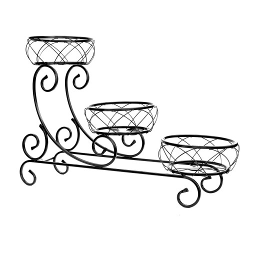 Kuty kwietnik na trzy doniczki. Kwietnik jest solidnie wykonany z metalu. Stoi stabilnie. Precyzyjnie wykonane kute elementy kwietnika dopasują się praktycznie do każdego stylu i ozdobią wnętrze Twojego mieszkania lub Twój ogród.