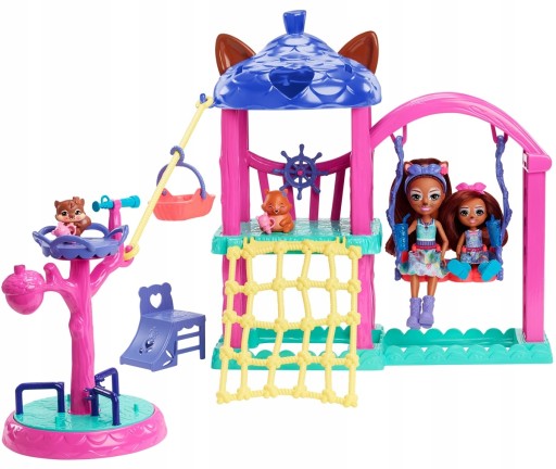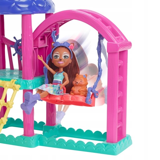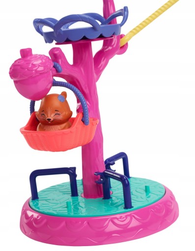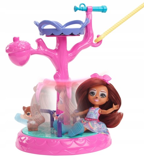 Razem z wiewiórkowymi siostrami Enchantimals™ możesz przeżyć niezapomniany dzień w parku dzięki wielu ruchomym elementom, takim jak huśtawka, tyrolka oraz obracające się karuzela i koło sterowe.