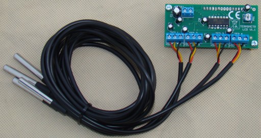 W komplecie jest termometr w obudowie oraz 4 czujniki cyfrowe DS18B20 wodoodporne.
