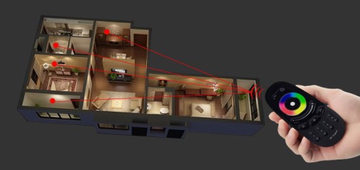 Pod jedna strefę można zaprogramować kilka odbiorników, w takim przypadku wszystkie połączone do danej strefy elementy (taśmy LED, żarówki) będą sterowane jednocześnie - co pozwala na znaczną rozbudowę systemu oświetlenia.