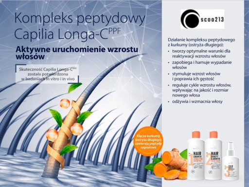 Są to cząsteczki peptydów roślinnych z kurkumy (ostryża długiego). Kompleks aktywnie stymuluje wzrost włosów, oddziałuje na brodawkę włosową, od której zaczyna się odżywianie komórek rosnącego mieszka włosowego oraz regeneracja włosa. Kompleks zapobiega i zmniejsza wypadanie włosów, stymuluje ich wzrost i poprawia gęstość.