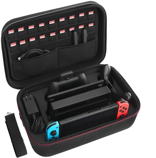 - Posiada dedykowane miejsca na: konsolę Nintendo Switch lub Switch Oled, stację dokującą Dock Set, Kontroler Pro, 2 Joy-Con, uchwyt grip ładujący, ładowarkę sieciową, kabel USB, 2x pasek do Joy-Con, 18 kart z grami,