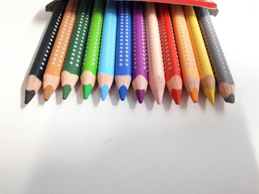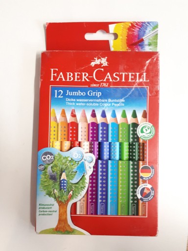 Kredki Jumbo Grip Faber-Castell 12 szt. w opakowaniu kartonowym + temperówka. Doskonałe do wielu technik artystycznych, dla hobbystów i dzieci. W większym rozmiarze Jumbo. Zachwycają żywymi i intensywnymi kolorami. Posiadają wysokiej jakości rozpuszczalny w wodzie pigment, umożliwiający osiągnięcie efektu jak przy wykorzystaniu tradycyjnych akwareli. To gwarancja fantastycznych rezultatów i doskonałej zabawy. Wystarczy kilka ruchów wilgotnym pędzlem po narysowanym wzorze, by wydobyć wyjątkowy efekt obrazu akwarelowego. Wyjątkowo gładkie i miękkie w aplikacji. Ergonomiczny trójkątny kształt i charakterystyczna dla tej serii opatentowana strefa Grip z małymi, antypoślizgowymi punktami zapewniają wysoki komfort użytkowania i niemęczące, wygodne rysowanie. Odpowiednie również dla leworęcznych. Kolory spieralne z większości tkanin. Grafity są wysoko odporny na pękanie, dzięki bezpiecznemu procesowi wiązania (SV). Wykonane z certyfikowanego drewna pochodzącego ze zrównoważonego i odpowiedzialnie zarządzanego leśnictwa. Powierzchnie pokryte lakierem na bazie wody – bezpiecznym dla środowiska i zdrowia dzieci. Emisja CO2 spowodowana procesem produkcyjnym tych produktów jest neutralizowana przez certyfikowane projekty. Dostępne w różnych kolorach i różnych zestawach.