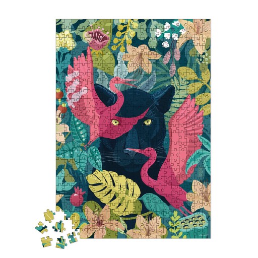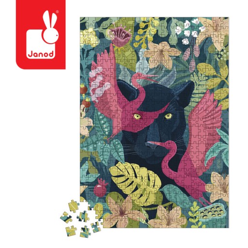 Puzzle artystyczne Mistyczna pantera francuskiej marki JANOD składają się z 500 elementów, które po ułożeniu tworzą piękną malarską grafikę: egzotyczną florę i faunę w oryginalnych barwach (m. in. zgaszonym różu, musztardowej żółci, oliwkowym czy nasyconym turkusie) z magnetyczną czarną panterą, umieszczoną centralnie w tle.