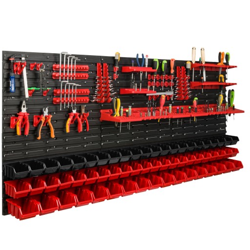 Świetny dodatek stanowią wytrzymałe uchwyty i półki narzędziowe pomagające przechowywać dłuższe narzędzia tj. młotek, wiertła, klucze, śrubokręt czy kombinerki. Dzięki uchwytom najważniejsze narzędzia będą zawsze pod ręką i zajmą znacznie mniej miejsca w warsztacie. Praktyczne oraz świetnie wyglądające rozwiązanie.