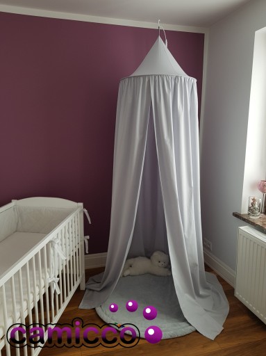 Baldachim zawieszony nad łóżeczkiem wprowadza bardzo przytulny klimat do pokoju dziecięcego
