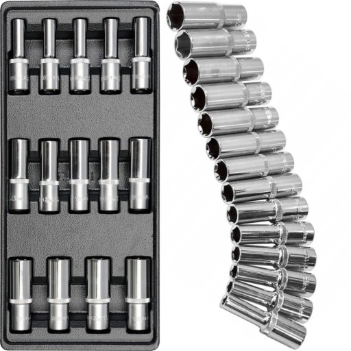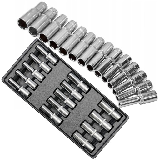 - Zawartość zestawu nasadka sześciokątna długa x14 (1/2" (12.7 mm): 8 mm, 9 mm, 10 mm, 11 mm, 12 mm, 13 mm, 14 mm, 15 mm, 16 mm, 17 mm, 18 mm, 19 mm, 20 mm, 21 mm)