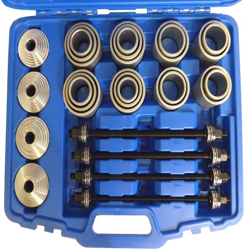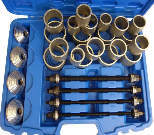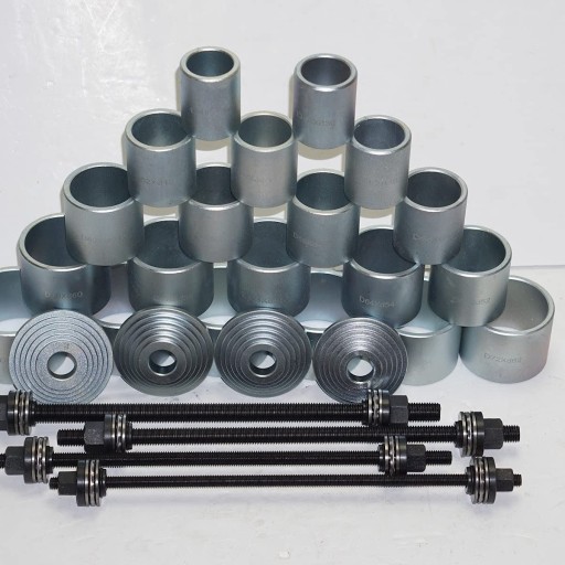 Zestaw 20 tulej do wyprasowywania/ wprasowywania tulei metalowo gumowych na samochodzie bez konieczności demontażu wahaczy, belek.Zestaw można stosować na prasie hydraulicznej lub zastosować siłownik przelotowy ciągnący.