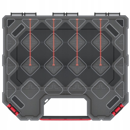 Solidne przezroczyste wieczko umożliwia szybkie zlokalizowanie szukanego produktu oraz pozwala na oszacowanie ilości znajdujących się wewnątrz elementów bez konieczności jego otwierania. Organizer posiada uchwyt transportowy do łatwego i wygodnego transportu.