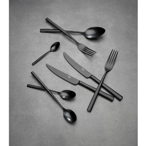 SU BLACK. Nowoczesne, wyjątkowe, minimalistyczne sztućce z matowym wykończeniem w kolorze modnej czerni. Ta kolekcja zachwyca swym minimalistycznym designem. Idealnie wyważona! Wyraźnie zarysowana linia ostrza, długie widelce i płynne połączenie górnej części z trzonkami nadaje tej kolekcji wizualnej lekkości. Widoczny grawer na części użytkowej, z symbolem rodzaju stali, zachwyca szykownym efektem wizualnym. Wyjątkowa linia pasująca do wnętrz w nowoczesnym stylu.