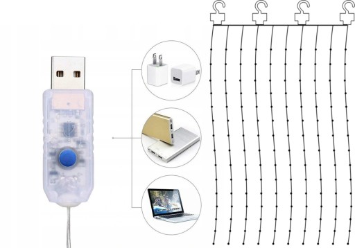 Lampy są wyposażone w port USB, który umożliwia wygodne ładowanie za pomocą komputera lub innych zasilaczy. Dla ułatwienia obsługi otrzymujesz bezprzewodowy pilot, który pozwala na wykonywanie świateł i ustawia aż 8 różnych trybów migania. Dodatkowo kurtyna posiada haczyki do montażu