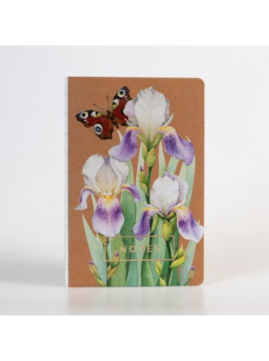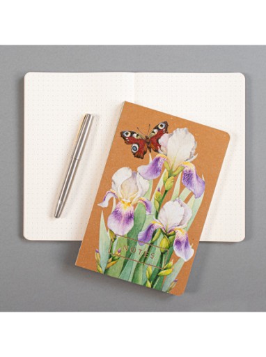 Okładka notesu z grafiką w biały irys syberyjski oraz tłoczony na złoto napis tworzą piękne zestawienie z naturalną tekturą.