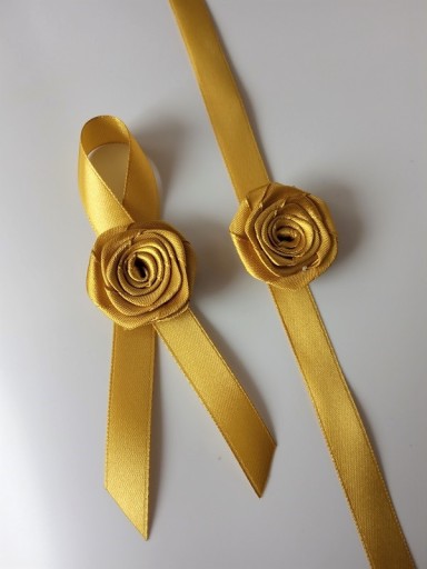 Przypinka wykonana jest z satynowej tasiemki o szerokości ok. 1,2cm i różyczki.