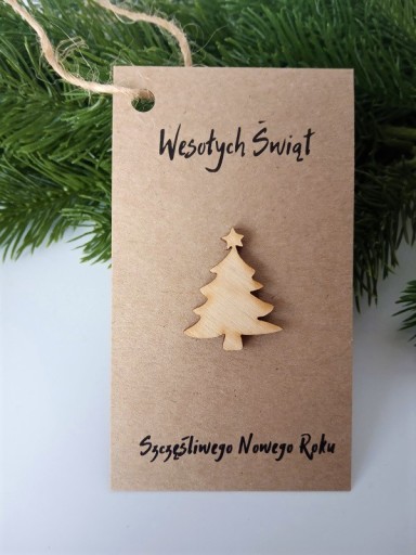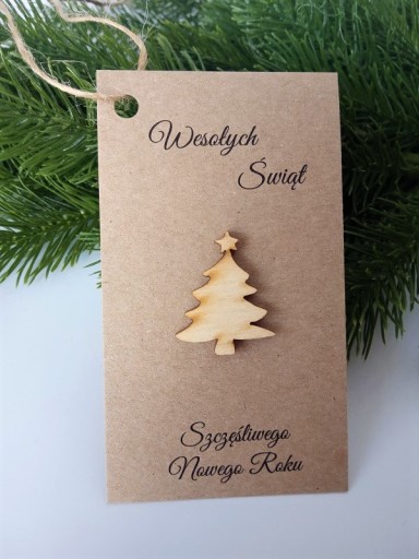 Świąteczne bileciki do prezentów na Mikołajki, Święta Bożego Narodzenia z drewnianą choineczką.