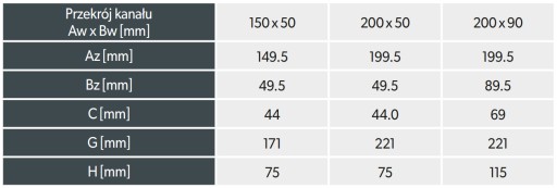 - Wymiar kanału: 200 x 50 mm
