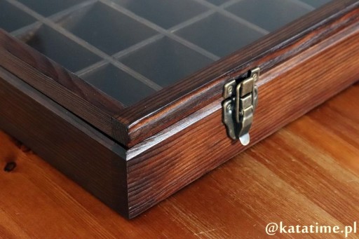 Elegancka i funkcjonalna, w całości ręcznie robiona, piękna skrzyneczka z drewna jodłowego, ponad 100-letniego, do przechowywania 24 sztuk zegarków. Wykonanie z pełnego drewna, szlifowanego, bejcowanego i lakierowanego lakierem ekologicznym o podwyższonej odporności na ścieranie. Ta skrzyneczka posłuży lata. Solidne zawiasy i zapięcie idealnie pasują do rustykalnego stylu całości. Kieszonki na zegarki są duże i głębokie, świetnie zabezpieczają zegarki przed uszkodzeniem oraz porysowaniem przez np. koronkę sąsiada, wygodnie zmieszczą się zegarki o szerokości nawet 50 mm! Szkło w wieczku skrzyneczki jest grube, hartowane dzięki czemu ma podniesioną odporność na stłuczenia i porysowanie. Warto popatrzeć na szczegóły wykonania. Pudełko jest podklejone filcem.