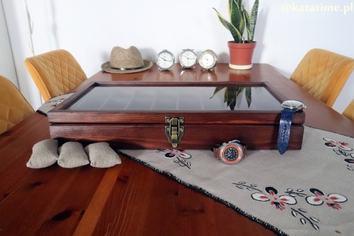 Elegancka i funkcjonalna, w całości ręcznie robiona, piękna skrzyneczka z drewna jodłowego, ponad 100-letniego, do przechowywania 24 sztuk zegarków. Wykonanie z pełnego drewna, szlifowanego, bejcowanego i lakierowanego lakierem ekologicznym o podwyższonej odporności na ścieranie. Ta skrzyneczka posłuży lata. Solidne zawiasy i zapięcie idealnie pasują do rustykalnego stylu całości. Kieszonki na zegarki są duże i głębokie, świetnie zabezpieczają zegarki przed uszkodzeniem oraz porysowaniem przez np. koronkę sąsiada, wygodnie zmieszczą się zegarki o szerokości nawet 50 mm! Szkło w wieczku skrzyneczki jest grube, hartowane dzięki czemu ma podniesioną odporność na stłuczenia i porysowanie. Warto popatrzeć na szczegóły wykonania. Pudełko jest podklejone filcem.