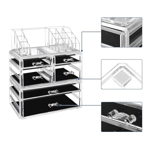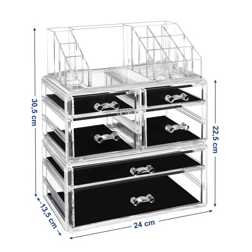 • Wszystko przejrzyście ułożone, wygląda szykownie i szlachetnie - przezroczyste jak szkło kryształowe, dzięki czemu dobrze widać, co jest w środku i oszczędza irytującego grzebania. zawsze stoi stabilnie, podczas gdy Twoja biżuteria lub różne przybory do makijażu w różnych rozmiarach w trzech szufladach o różnych wysokościach doskonale znajdują swoje miejsce i pozostają chronione przed kurzem.