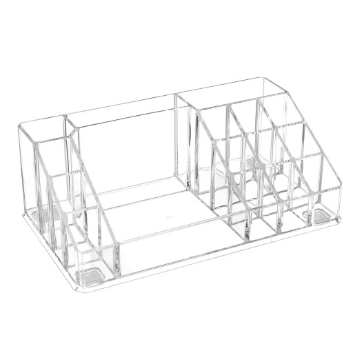 • Bardzo funkcjonalny, cudo do przechowywania - można w nim posegregować różne przybory. W górnych 16 przegródkach o różnej wysokości i wielkości (po 4 przegródki w każdym rzędzie, odpowiednia wysokość trzech rzędów: 3/4,5/6 cm) można przechowywać szminki, lakier do paznokci, pędzle do makijażu, tusz do rzęs, kredki do brwi, eyelinery itp.