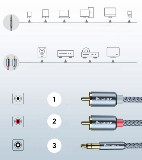 NIESAMOWICIE WYTRZYMAŁY PRZEWÓD AUDIO ESSAGER MINI JACK 3.5MM - 2x RCA CINCH O DŁUGOŚCI 3m